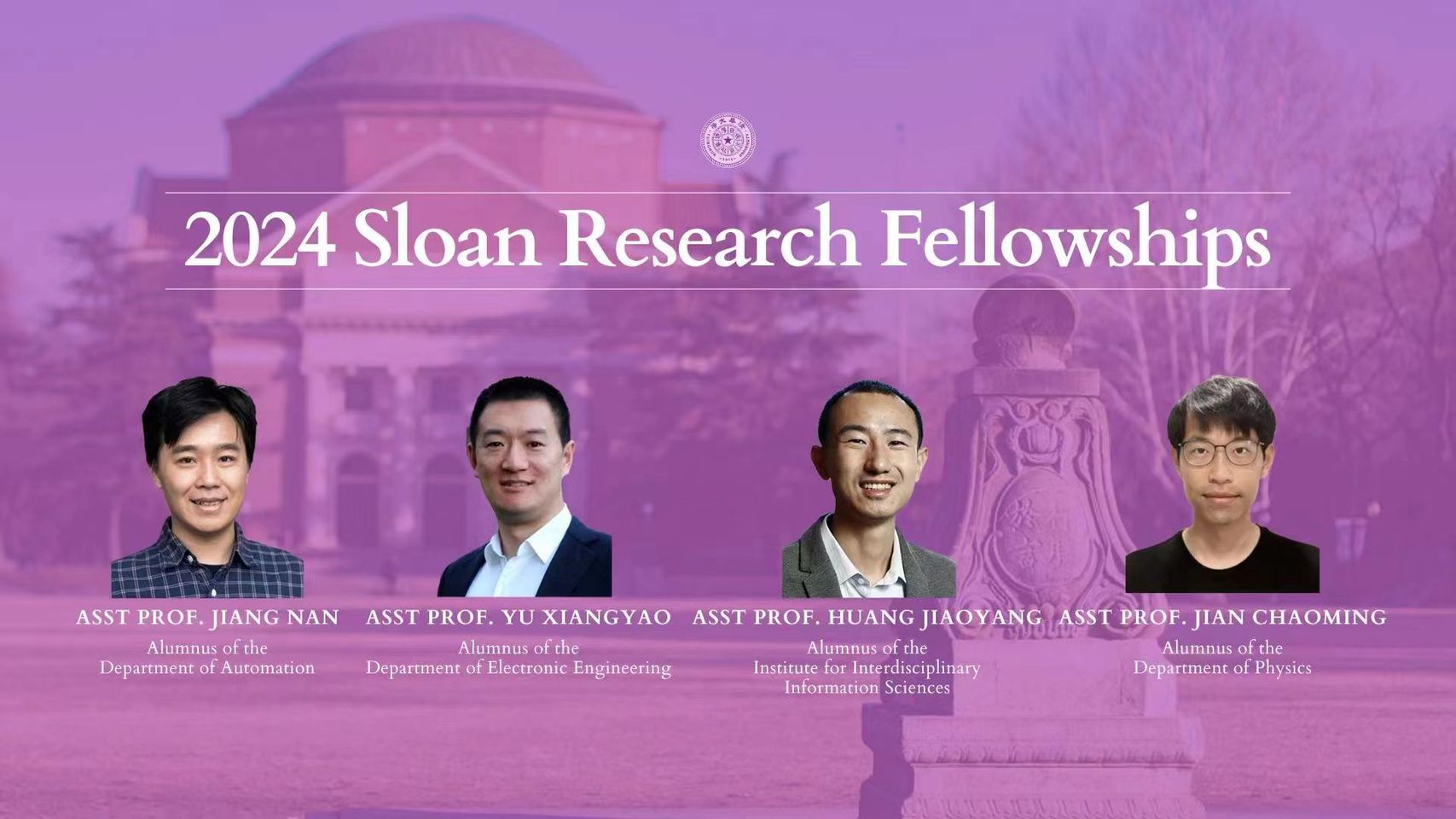 Congratulations to Tsinghua alumni Jiang Nan, Yu Xiangyao, Huang Jiaoyang, and Jian Chaoming for being awarded Sloan Research Fellowships by the Alfred P. Sloan Foundation, honoring their contributions to AI, database system, neural network optimization and Quantum Physics!