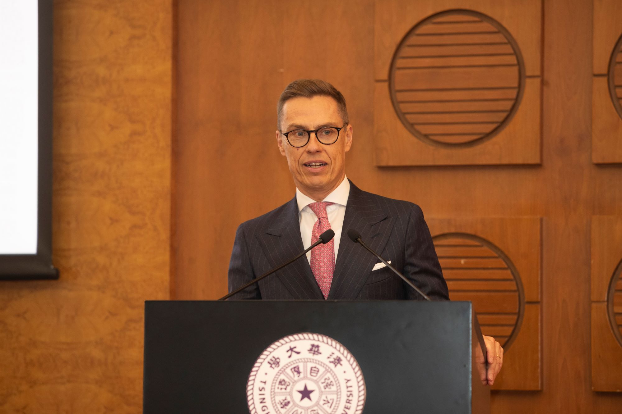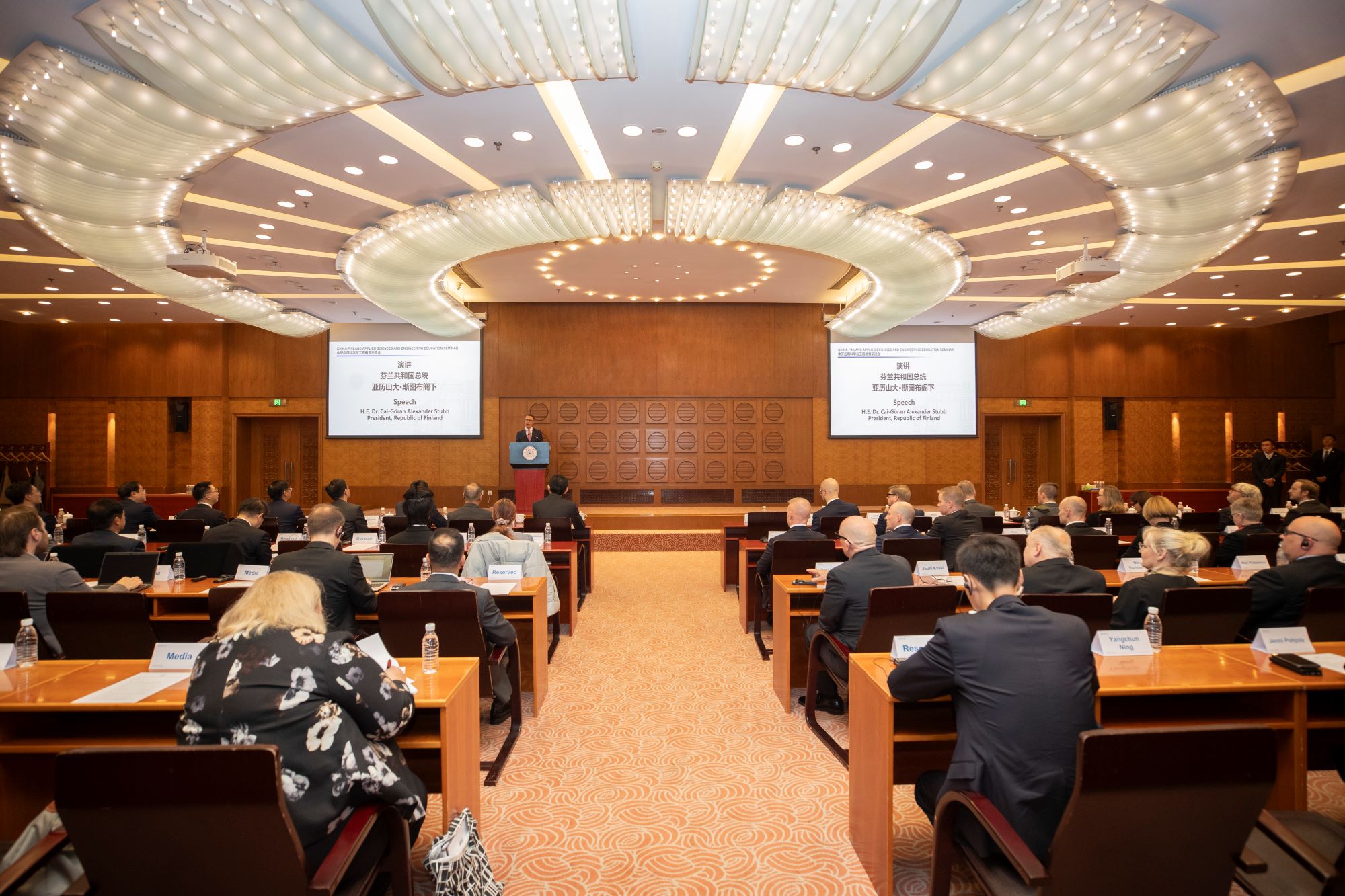 Finnish President Cai-Göran Alexander Stubb delivers a speech at the China-Finland Applied Sciences and Engineering Education Seminar