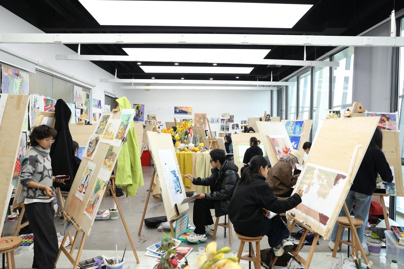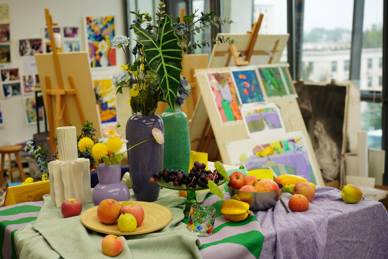 In each classroom, the standardized still life setups include a variety of vessels, vases, and other decorative items, all set against elegant backdrops. Rich reds, yellows, blues, and soothingly elegant color combinations form lively and vivid palettes, complemented by natural elements such as flowers and fruit, breathing life and vibrancy into each group of subjects for drawing.