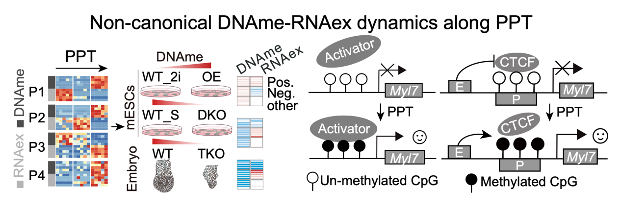 Integrative analyses of DNA methylome and transcriptome reveal that, in the EPI from E3.5 to E5.5, most genes conform to the negative relationship between promoter DNAme and RNA expression (RNAex)—high promoter DNAme coincides with transcriptional repression—whereas a minority exhibit a positive, concordant coupling of promoter DNAme and RNAex. This non-canonical pattern is conserved across mouse and human. Gain- and loss-of-function experiments in Dnmt3a/b-modified mESCs, together with transcriptomic profiling of Dnmt1/3a/3b triple-knockout EPI, confirm the universality of this positive DNAme–RNA coupling in both stem-cell and embryonic contexts. Multidimensional interrogation of regulatory factors suggests that this epigenetic program is orchestrated through combinatorial mechanisms, including CTCF eviction and recruitment of lineage-specific activators such as Znf692, to fine-tune developmental gene expression during lineage specification (Figure 4).