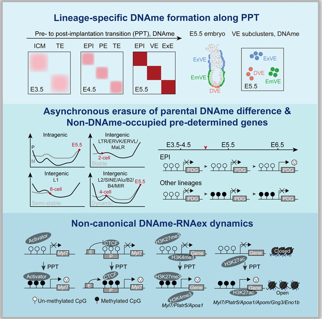 In sum, this study uncovers lineage-specific DNAme dynamics in peri-implantation embryos and distinct DNAme patterns among VE subpopulations; it delineates the asynchronous erasure of parental DNAme differences across diverse genomic elements; and it identifies diverse promoter DNAme–RNAex dynamics during PPT, notably revealing a non-canonical positive coupling between DNAme and RNAex. These findings offer new perspectives on the interplay between epigenetic modifications and gene expression during early embryonic development.