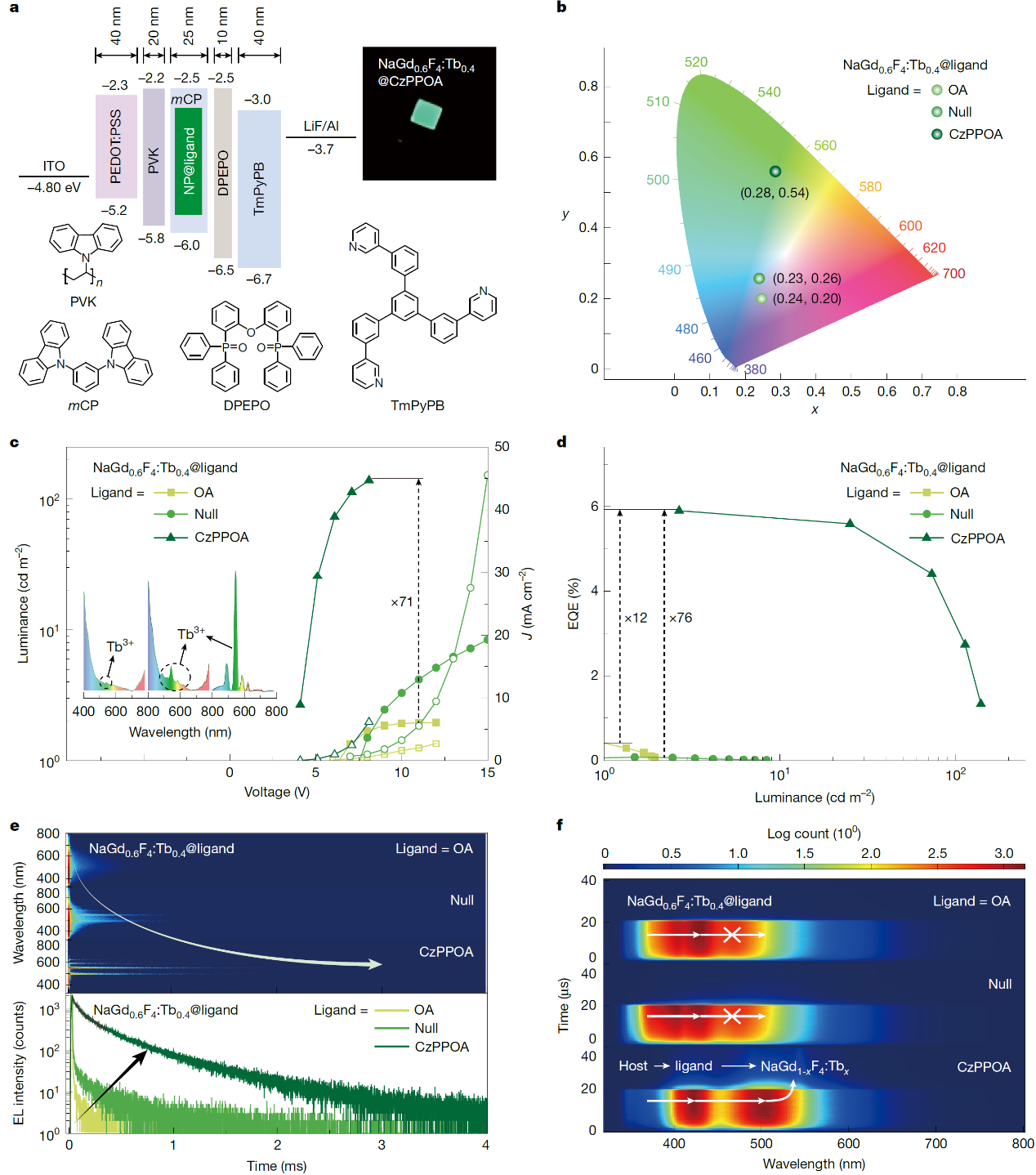 This study demonstrates highly efficient electroluminescence from lanthanide nanocrystals achieved through a ligand engineering approach. By leveraging the optoelectronic synergy of organic semiconductor ligands, the research team established a multifunctional strategy that goes beyond conventional surface passivation. The engineered ligands facilitate the confinement of charges and excitons within the nano-hybrid system, effectively allocating exciton energy to the lanthanide emitter ions. These characteristics yield electroluminescence with exceptional color purity, spectral tunability, and high energy efficiency. More importantly, these results highlight the potential of this ligand-functionalized nanocrystal platform for multi-spectral electroluminescence, particularly in applications such as high-resolution, wide-color-gamut displays and near-infrared technologies.