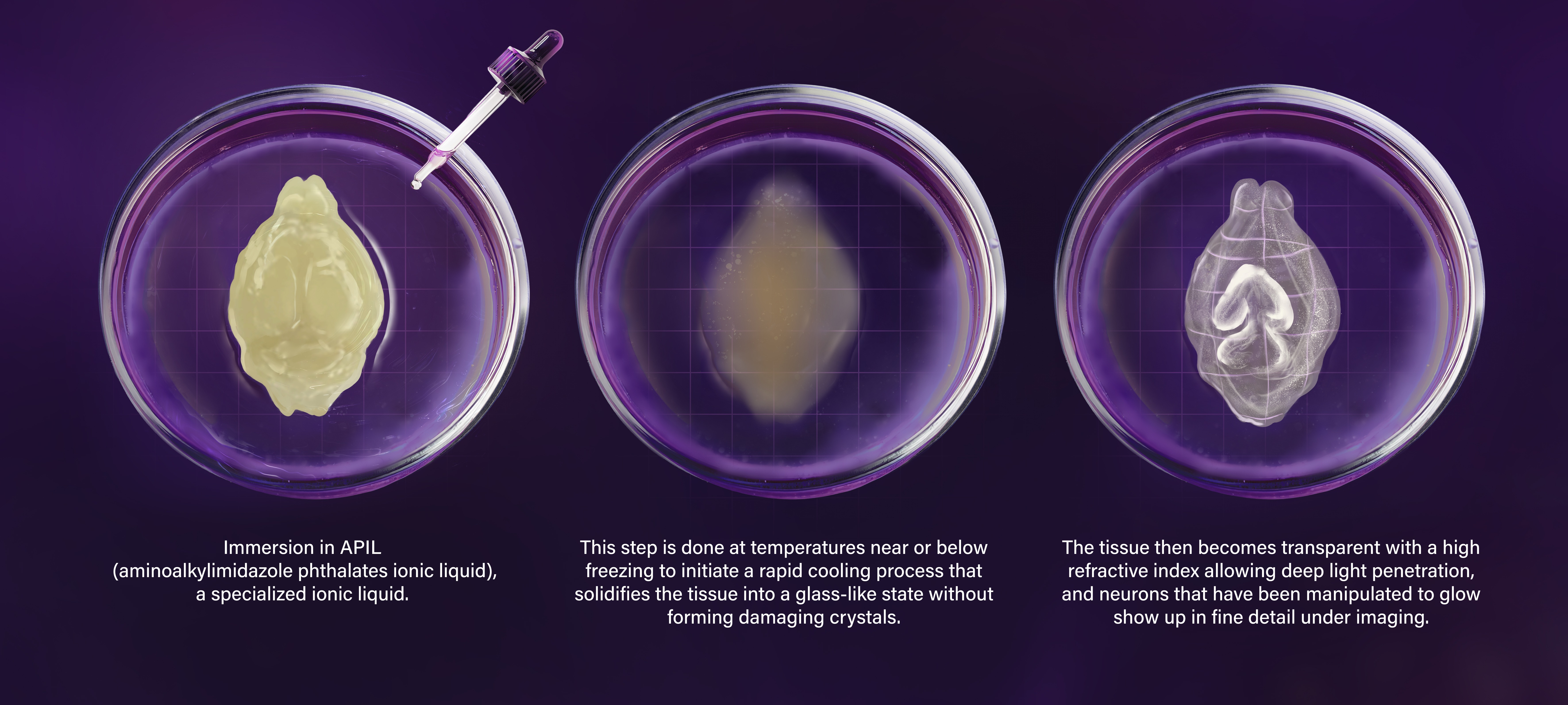 APIL is an ionic liquid that supports a rapid cooling process known as vitrification, which solidifies liquid into a glass-like state. When tissue samples are immersed in APIL under near-freezing conditions, the solution induces this state without forming ice crystals. This prevents the structural damage typically caused by freezing and preserves tissues in a finely organized, clear condition suitable for high-resolution imaging.