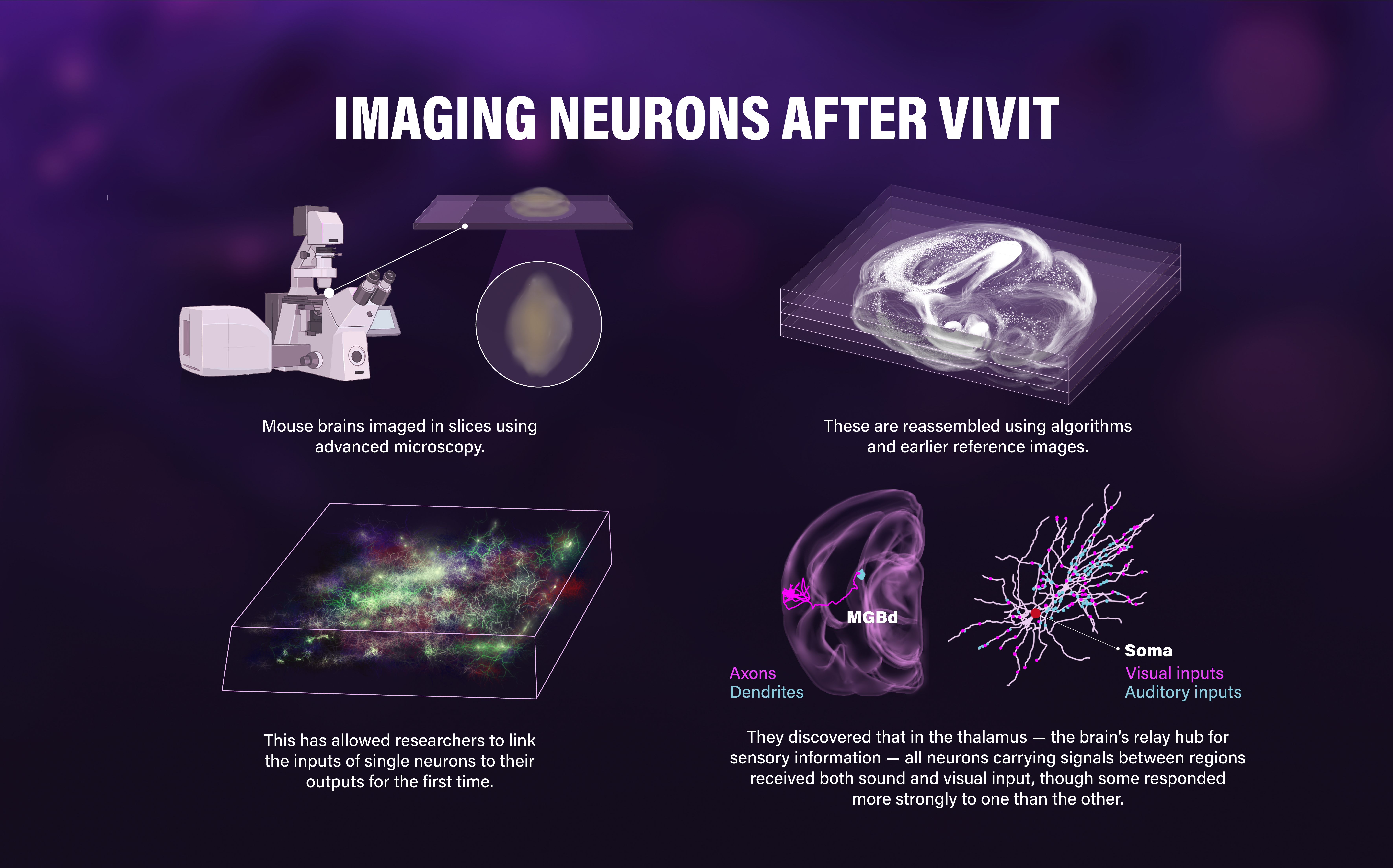 Their analysis showed that distinct types of neurons in the thalamus specialize in different senses — some processing auditory signals, others visual — and relay them to separate brain areas.