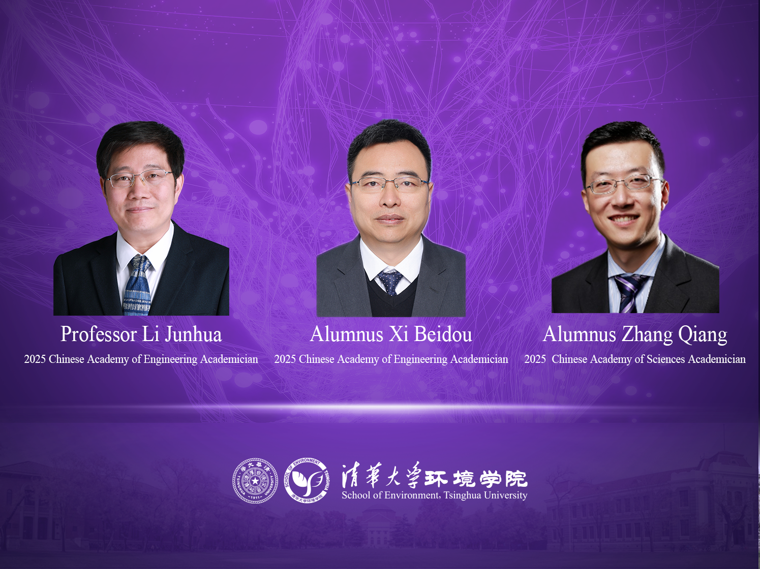 On November 21, the Chinese Academy of Sciences (CAS) and the Chinese Academy of Engineering (CAE) announced the results of their 2025 academician election. Professor Li Junhua from the School of Environment (SOE) was elected to the CAE. In addition, Xi Beidou (Ph.D. 2002 Alumnus of SOE, formerly the Department of Environmental Science and Engineering), President of the Chinese Research Academy of Environmental Sciences, was elected to the CAE. Professor Zhang Qiang (B.S. 2000, Ph.D. 2006 Alumnus of SOE, formerly the Department of Environmental Science and Engineering), Professor at the Department of Earth System Science, Tsinghua University, was elected to the CAS.
