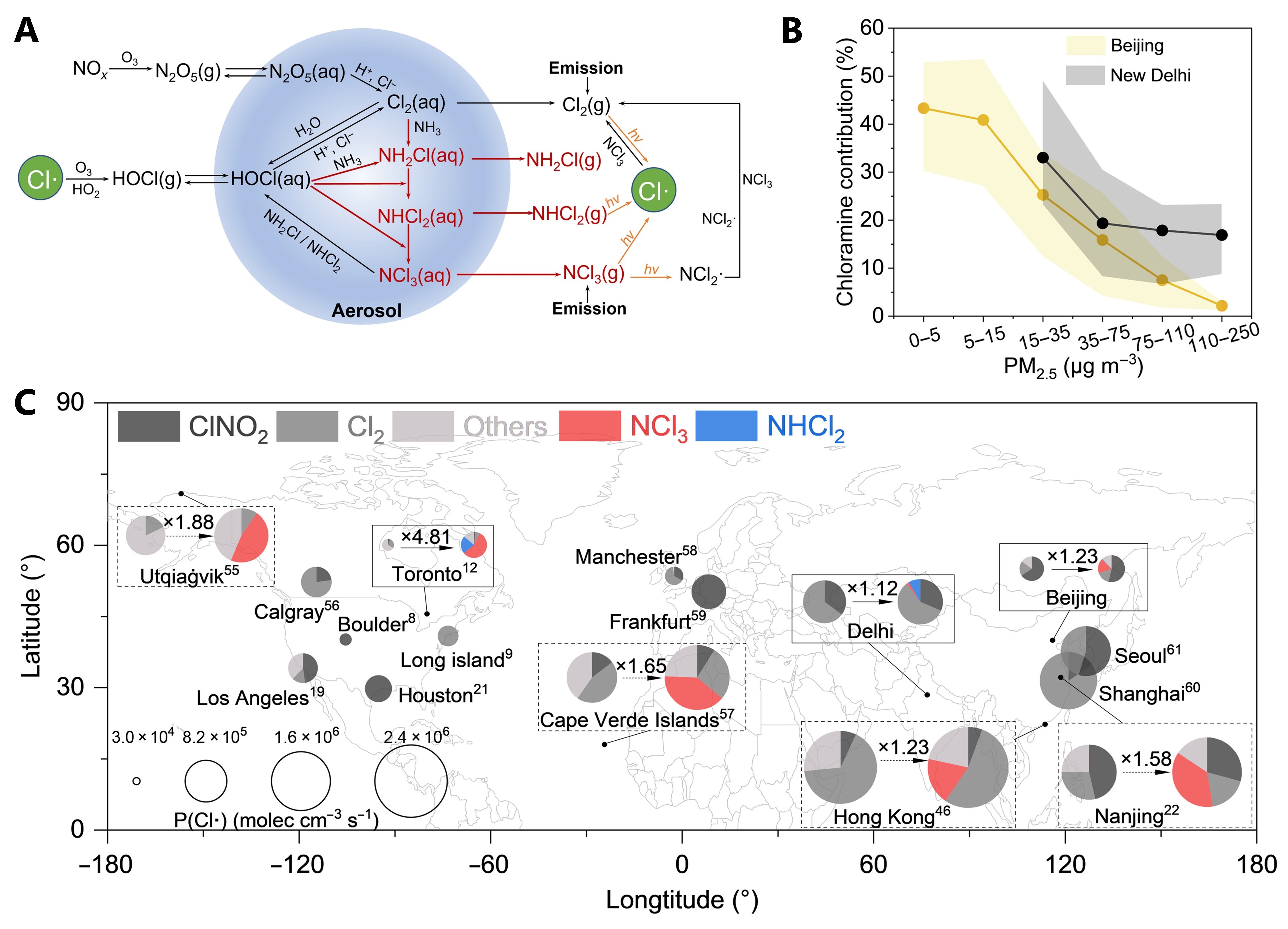 Figure 2. (A) Schematic of atmospheric chloramine sources and transformations; (B) Relationship between the contribution of chloramines to chlorine radicals and PM2.5 concentrations in Beijing and Delhi; (C) Impact of chloramine multiphase chemical mechanisms on the generation rate of atmospheric chlorine radicals worldwide.
