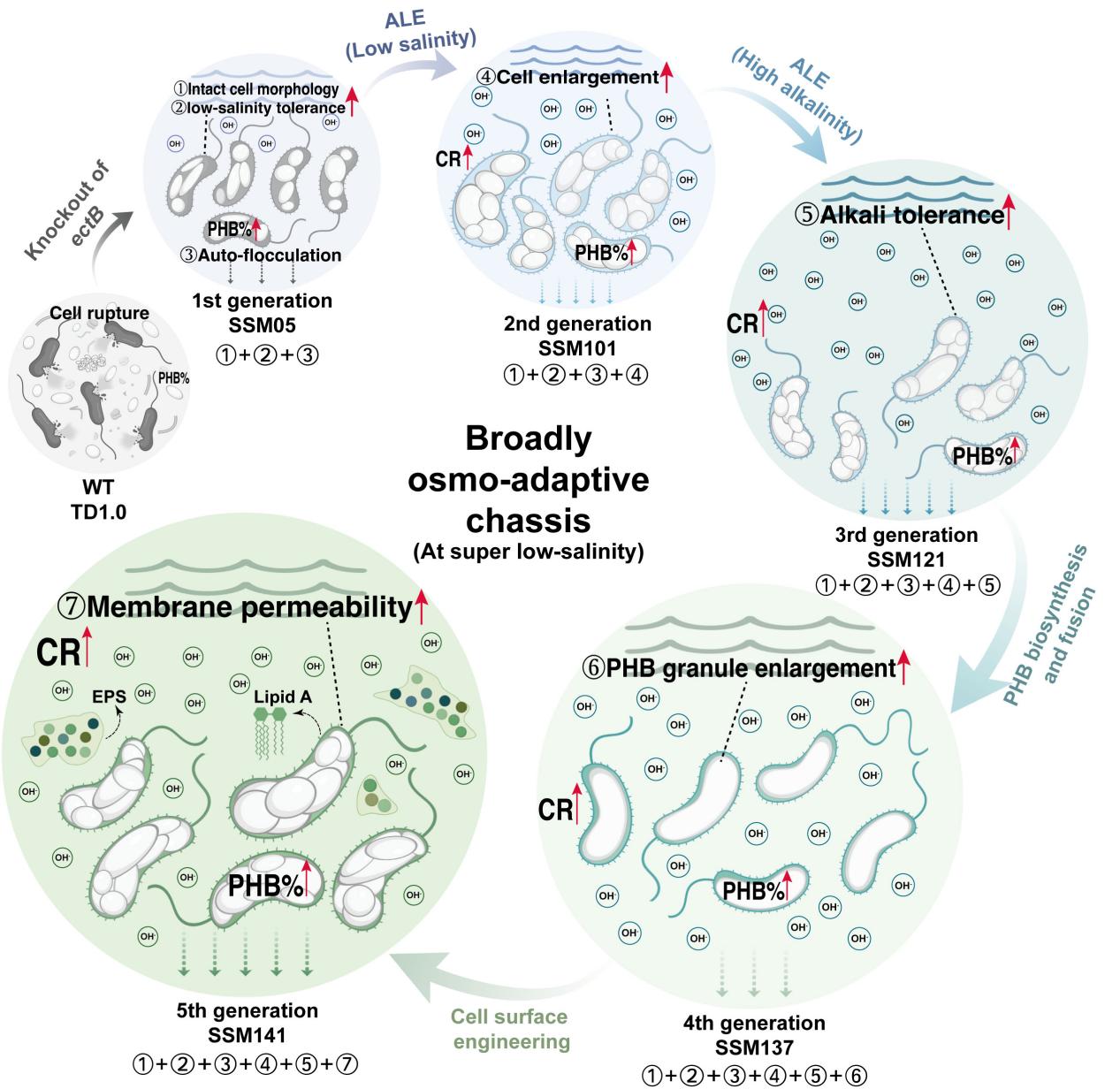 图2.迭代工程化改造构建的广域盐度适应型H.bluephagenesis SSM系列底盘的模式图
