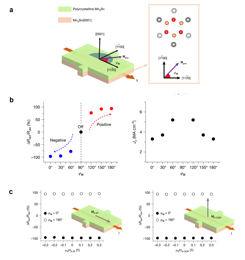 团队通过满足单晶和多晶Mn3Sn所需的不同生长条件,利用分子束外延生长技术构筑了手性反铁磁Mn3Sn同质结(图1a),利用Mn3Sn(0001)产生面外自旋极化(σz),翻转在多晶Mn3Sn层的手性反铁磁序。通过面内大磁场进行预磁化(图1a),操控Mn3Sn(0001)层的磁序取向,进而控制磁自旋霍尔效应,实现零场翻转的开关和极性的反转(图1b)。对比铁磁翻转极易受外磁场的干扰,手性反铁磁的全电学翻转呈现出优越的抗磁场干扰特性(图1c)。