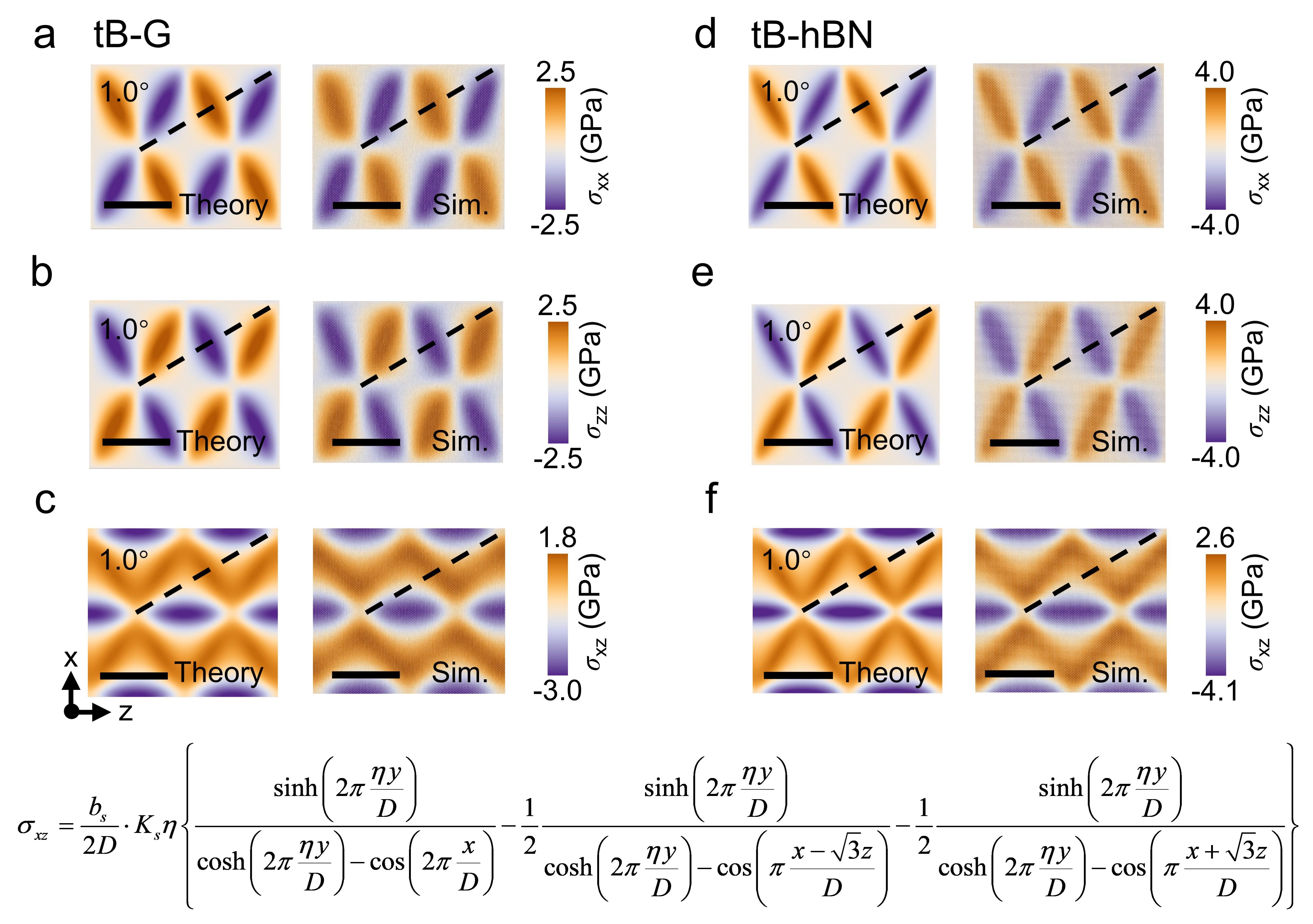 针对上述问题和挑战,清华大学航院以及力学与工程交叉研究院李晓雁教授课题组基于各向异性位错理论,建立了一套全解析的理论模型,清晰地揭示了“扭转角度—结构变形—能量特征”三者间的精确定量关系。在小扭转角度下,扭转二维材料的莫尔云纹主要表现为由分位错构成的三角形网络结构。该模型给出了扭转二维材料的局域旋转场、应变场及应力场的完整解析表达式(图2-4),并阐明了能量密度随扭转角度变化的非线性规律(图5)。当扭转角度较大时,莫尔云纹则呈现以AA堆垛为核心的六边形畴结构及伴随的畴壁网络。针对这一结构特征,该模型同样建立了能量密度与扭转角度之间的解析关系。在0°到30°的扭转角度范围内,随着角度增大,扭转二维材料的能量密度呈现先快速升高、后逐渐趋于饱和的变化趋势(图5)。为进一步验证和完善理论模型,针对扭转双层石墨烯(tB-G)、扭转六方氮化硼(tB-hBN)及扭转三层石墨烯(tT-G)体系开展了大规模原子模拟,并将理论预测与模拟结果和已有研究进行了对比。模型所预测的局域旋转场、应变场、应力场以及能量密度随扭转角的变化规律,均与原子模拟结果以及已有实验和模拟数据高度吻合(如图2、图3、图5),表明该理论模型能够准确描述扭转二维材料的结构变形与能量演化特征。该研究不仅深化了对二维材料莫尔超晶格物理机制的认知,也为系统表征该类材料的变形与能量特征提供了一套完整的解析理论框架,为主动设计和精准调控扭转二维材料的物理特性提供了重要的理论基石。