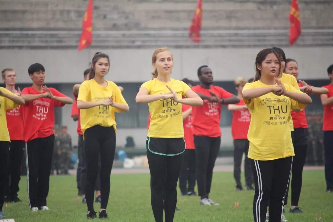 为了让国际新生们开学后更容易适应清华大学特有的体育教学体系,拓展营还安排了清华拳、体能素质训练、游泳课等体育课程,并结合学生兴趣,开展足球、网球、健美操、跆拳道、毽球、轮滑等多种形式的体育专项训练,引导国际学生养成良好的运动习惯,深入感受“无体育,不清华”的清华体育精神。