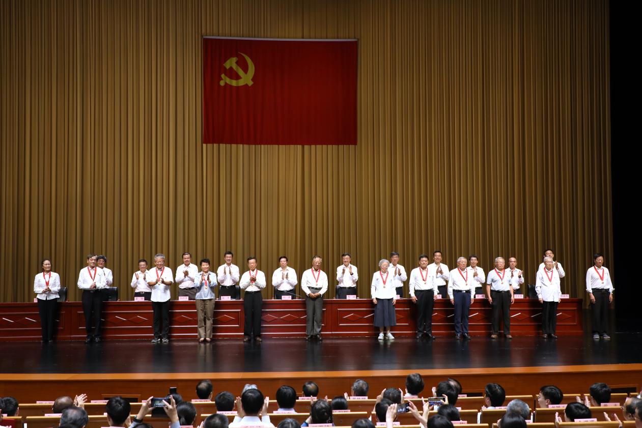 与会校领导向受表彰的集体和个人代表颁奖,并向获得“光荣在党50年”纪念章的党员代表颁发纪念章。