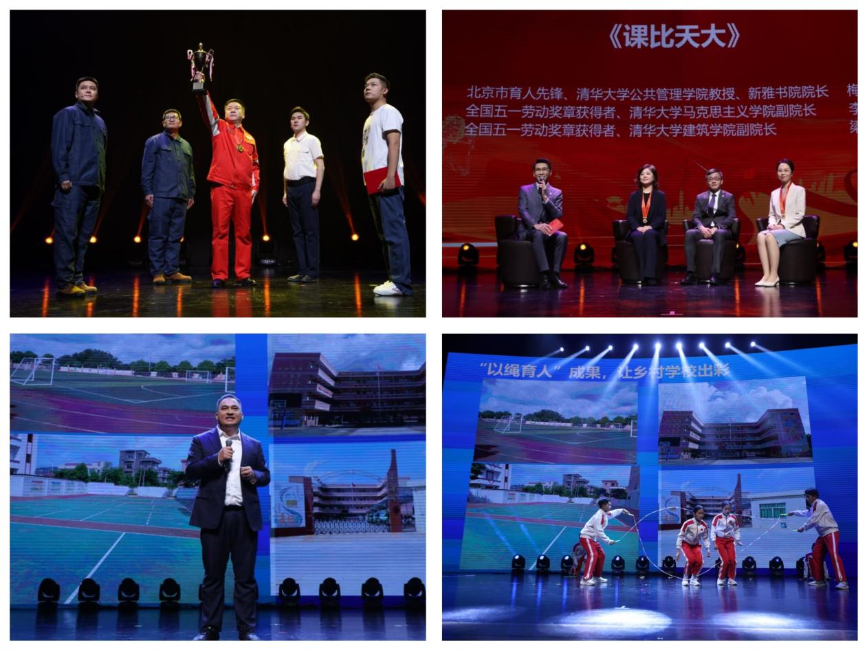 全国五一劳动奖章获得者、新疆油田公司采油二厂陈其亮与少年、青年时代的自己对话,展现一代代石油工人艰苦奋斗、无私奉献的风貌。北京市育人先锋、清华大学新雅书院院长梅赐琪与全国五一劳动奖章获得者、清华大学马克思主义学院副院长李蕉,清华大学建筑学院副院长梁思思进行圆桌对话,讲述“春风化雨,课比天大,薪火相传,不忘初心”的清华青教赛精神。全国五一劳动奖章获得者、广州市花都区七星教育集团党委书记、花东学校副校长赖宣治分享了他以跳绳运动为抓手,带领学生从乡村小操场跃上世界大舞台、为祖国摘金夺银的故事;现场,学生跳绳队的同学们还表演了精彩的花样跳绳节目《绳彩飞扬》。