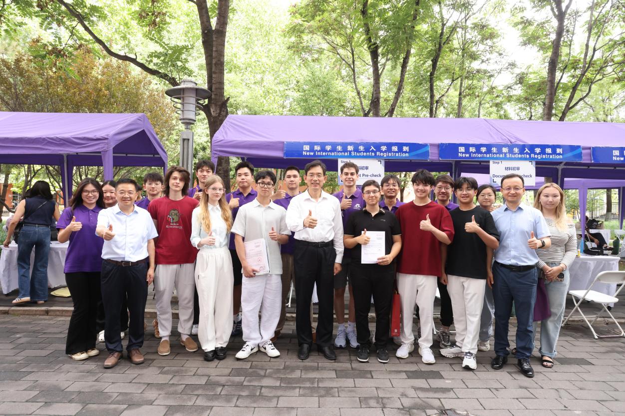 “你来自哪里?”“在清华读什么专业?”……在紫荆学生公寓23号楼国际新生报到点,李路明与来自不同国家的志愿者和新生亲切交流,鼓励同学们尽快融入清华的学习生活,并检查宿舍服务保障与安全管理情况。
