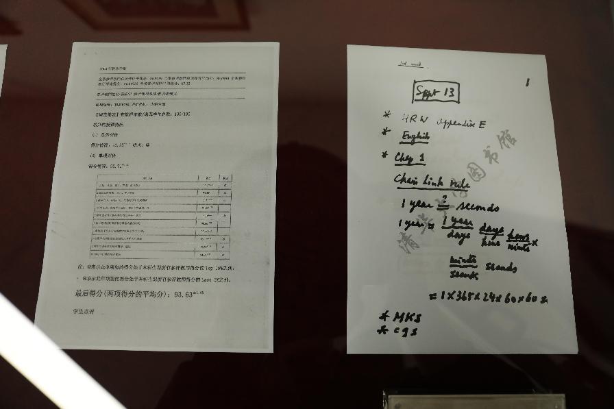 走进书屋,迎面悬挂的相框里,杨振宁先生目光温和如昔。室内陈列着照片、画作、手稿等珍贵资料,书架上整齐摆放着杨振宁先生的著作、藏书和相关传记,每一件展品似乎都在无声地讲述着杨振宁先生归根清华的动人故事。展柜内教学幻灯片手稿引人注目,物理公式遒劲清晰,仿佛看到了杨振宁先生站在三尺讲台上潜心育人的身影,挚友邓稼先的往来书信诉说着两位科学巨擘的治学心迹与家国情怀,“但愿人长久,千里共同途”的瞩望透过展柜直抵人心。