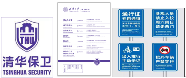 保卫处在美术学院支持下,设计完成并启用“清华保卫”视觉识别系统(Visual Identity,简称VI),其中包括基础和应用两大部分。核心标识融合了清华元素和安保工作的特色和理念,并在此基础上产生一系列应用,均实现中英双语。以“清华保卫”的图形标识为例,这一标识由“二校门”剪影,清华大学英文缩写字母“THU”以及象征保卫、安全的盾牌组成,既体现了清华大学深厚的底蕴,也展现了清华大学的国际化形象。保安人员的背贴由“清华保卫”及其英文“TsinghuaSecurity”组成,可以帮助学生更方便地识别保安人员,在有需要时及时求助。在日常校园安全管理当中,校内交通标识标牌等设施、设备双语化程度现已达到90%及以上,为国际学生的生活带来了较大便利,也展示了国际化的校园安全形象。