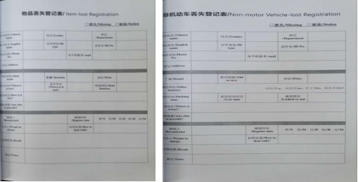 物品丢失登记表(左) 非机动车丢失登记表(右)
