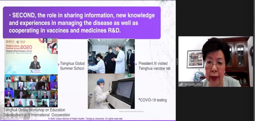 对话活动的第一场讲座“全球卫生安全和新冠疫情下高校的独特作用”于2020年8月10日成功举办。由世界卫生组织(WHO)荣誉总干事、清华大学万科公共卫生与健康学院首任院长陈冯富珍作为讲座主讲人。她回顾了全球卫生安全历史上的疫情及变化,以新冠肺炎疫情为背景,讨论了高校能够在三个方面发挥的独特作用。学院老师、学院各个项目的国内国际学生共计约200人在线参加了这次讲座。