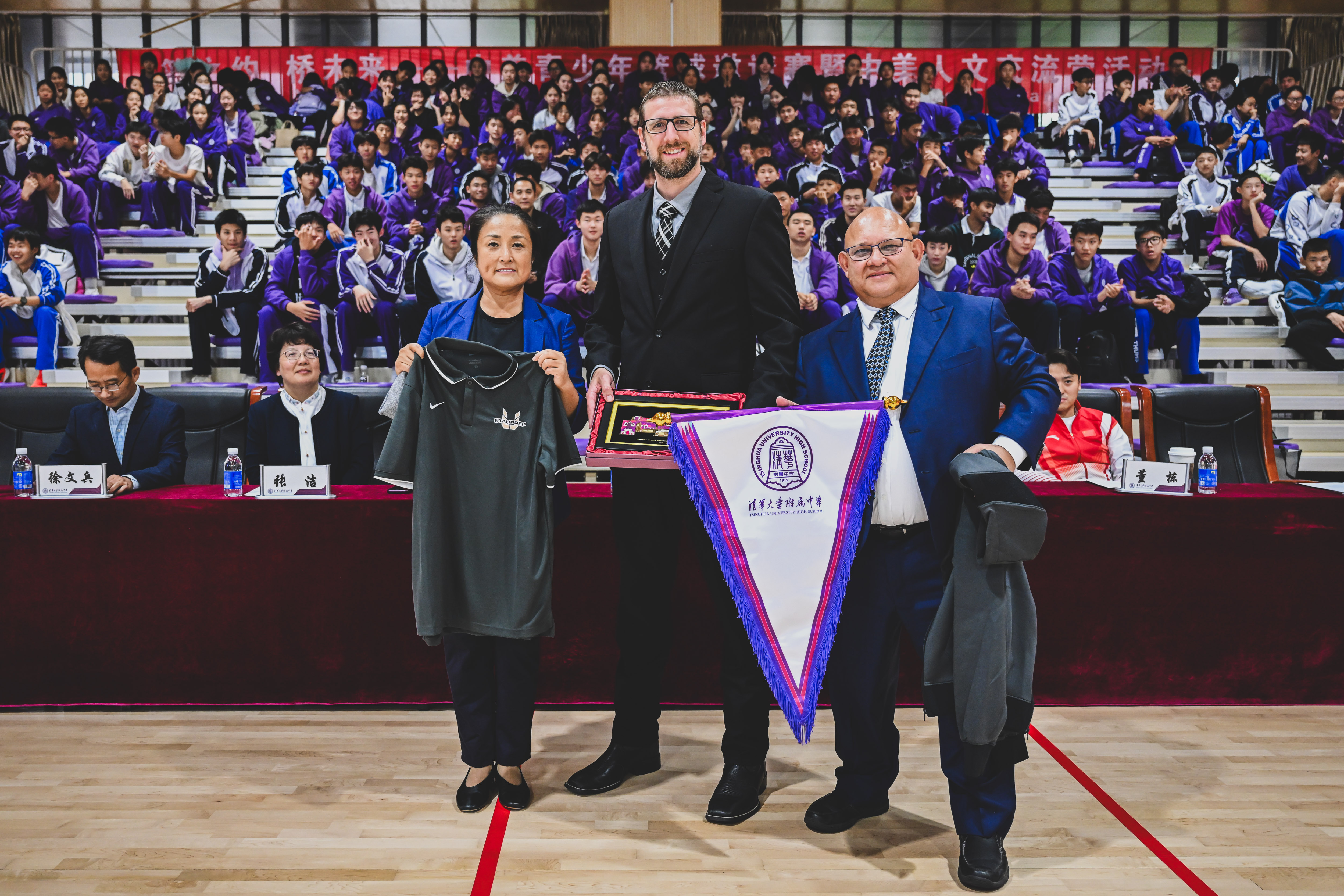 清华新闻网10月15日电 由教育部中外人文交流中心组织的“中美青少年篮球邀请赛暨中美人文交流营”活动,首站于10月9日至12日走进清华大学附属中学(以下简称“清华附中”),并于10月10日举行篮球邀请赛。教育部中外人文交流中心主任于长学,美国犹他预科学院校长凯尔·斯宾塞、教务长韦恩·布里格斯及来访学生,北京体育大学教授、伦敦奥运会男子蹦床金牌得主董栋,清华附中校长方妍和副校长张洁、徐文兵以及马约翰体育特长班师生参加邀请赛开幕式。