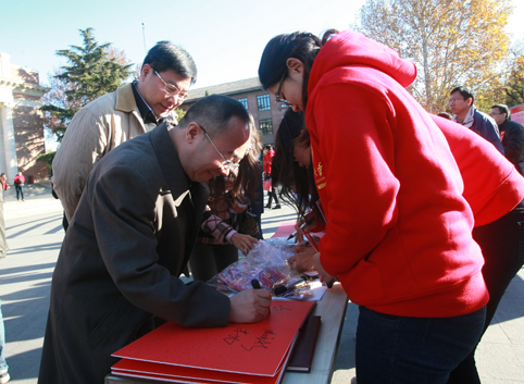 校长陈吉宁与1989级建筑学院校友、朝阳区副区长张立新交谈。