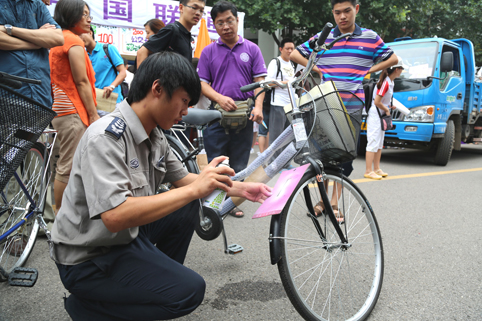 为新生的自行车喷上学号。记者 苑洁
