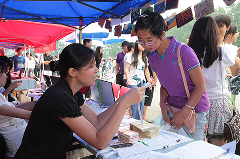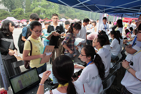 各个院系“花招”频出迎接新生。记者 苑洁