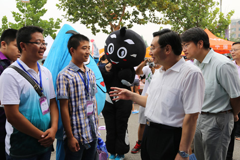 校党委书记胡和平与新生亲切交谈。记者 苑洁