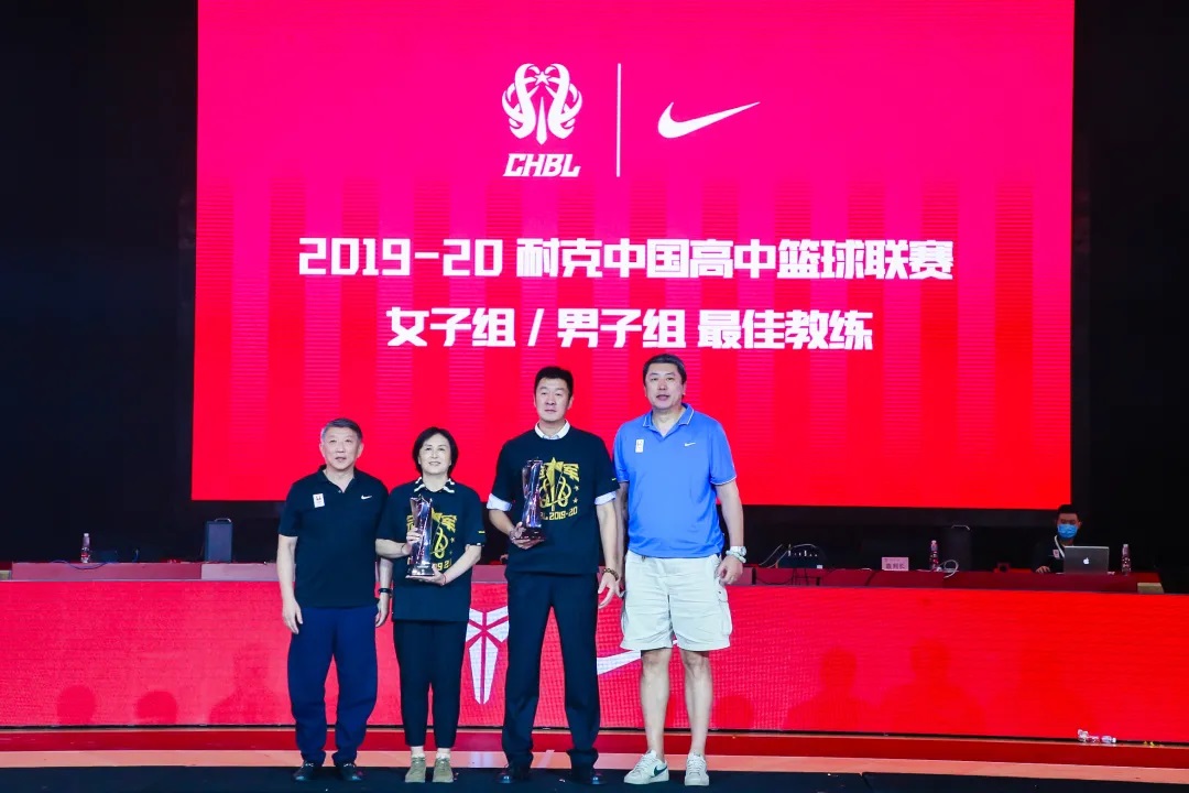 中国篮球协会副主席宫鲁鸣(左一),中国篮球协会副主席、陕西省篮球协会主席王立彬(右一)为清华附中女篮主教练王丽(左二)、男篮主教练张涛(右二)颁发本赛季耐克中国高中篮球联赛最佳教练奖项