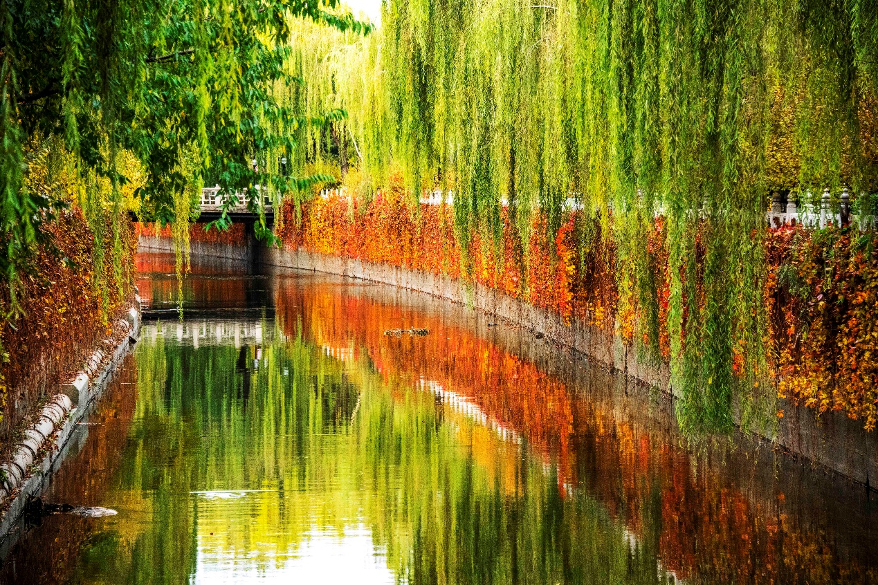 寒潭明澈,倒映两岸五彩斑斓