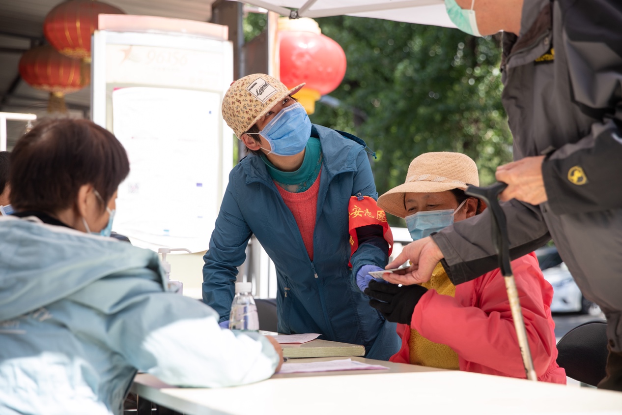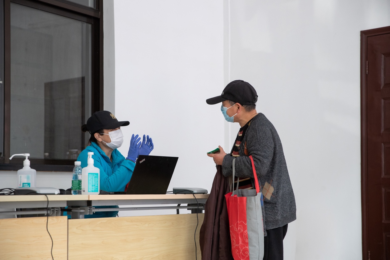 校医院退休大夫陈老师作为志愿者,正在帮助和接待前来接种疫苗的老同志