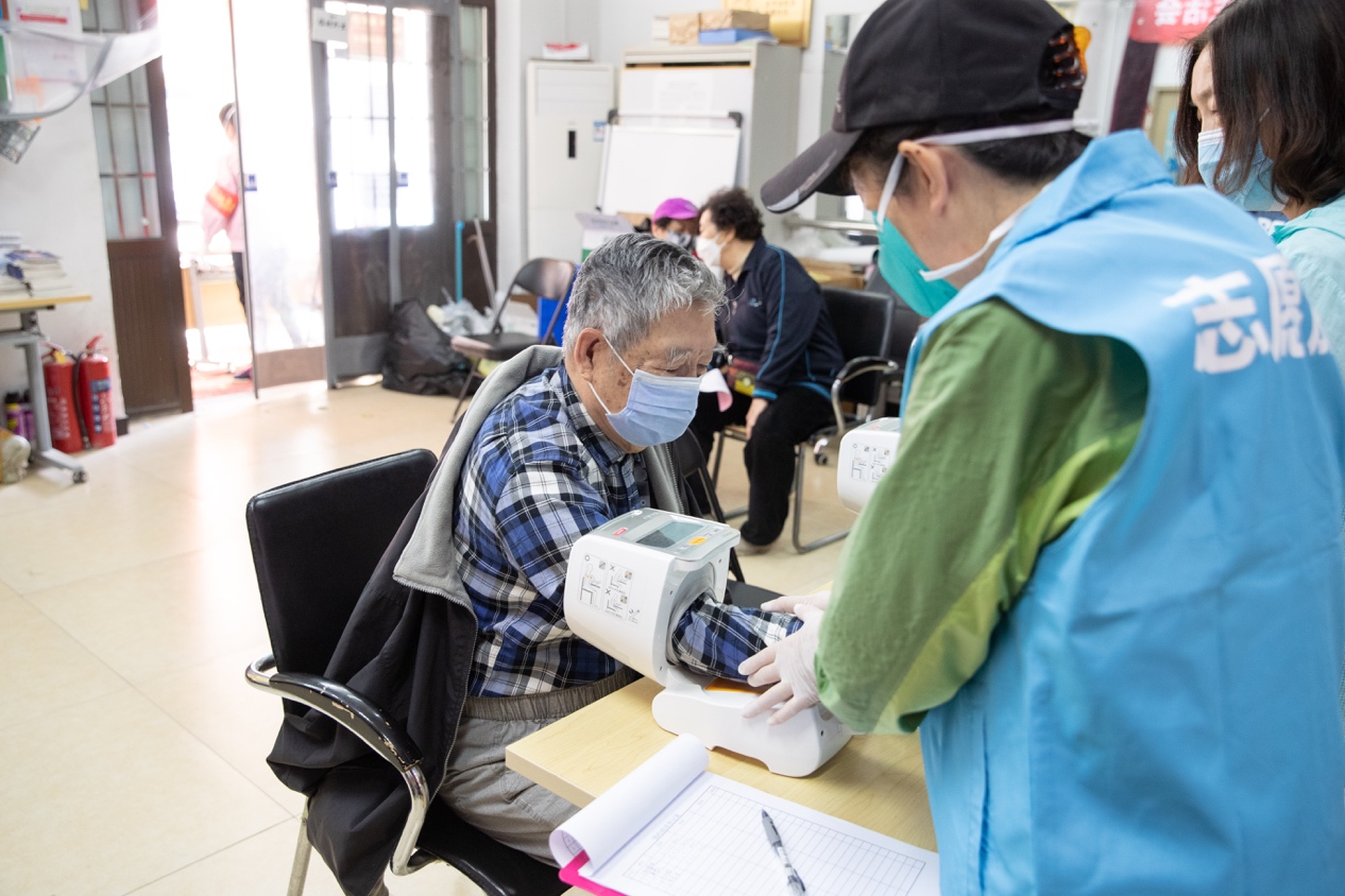 疫苗接种前,志愿者为老同志测量血压