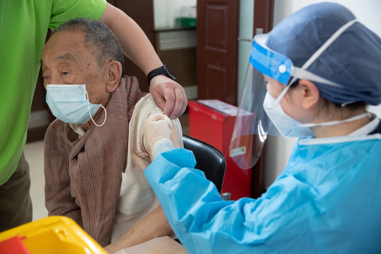 留观时间结束后,老同志在志愿者的引导下离开,完成疫苗接种