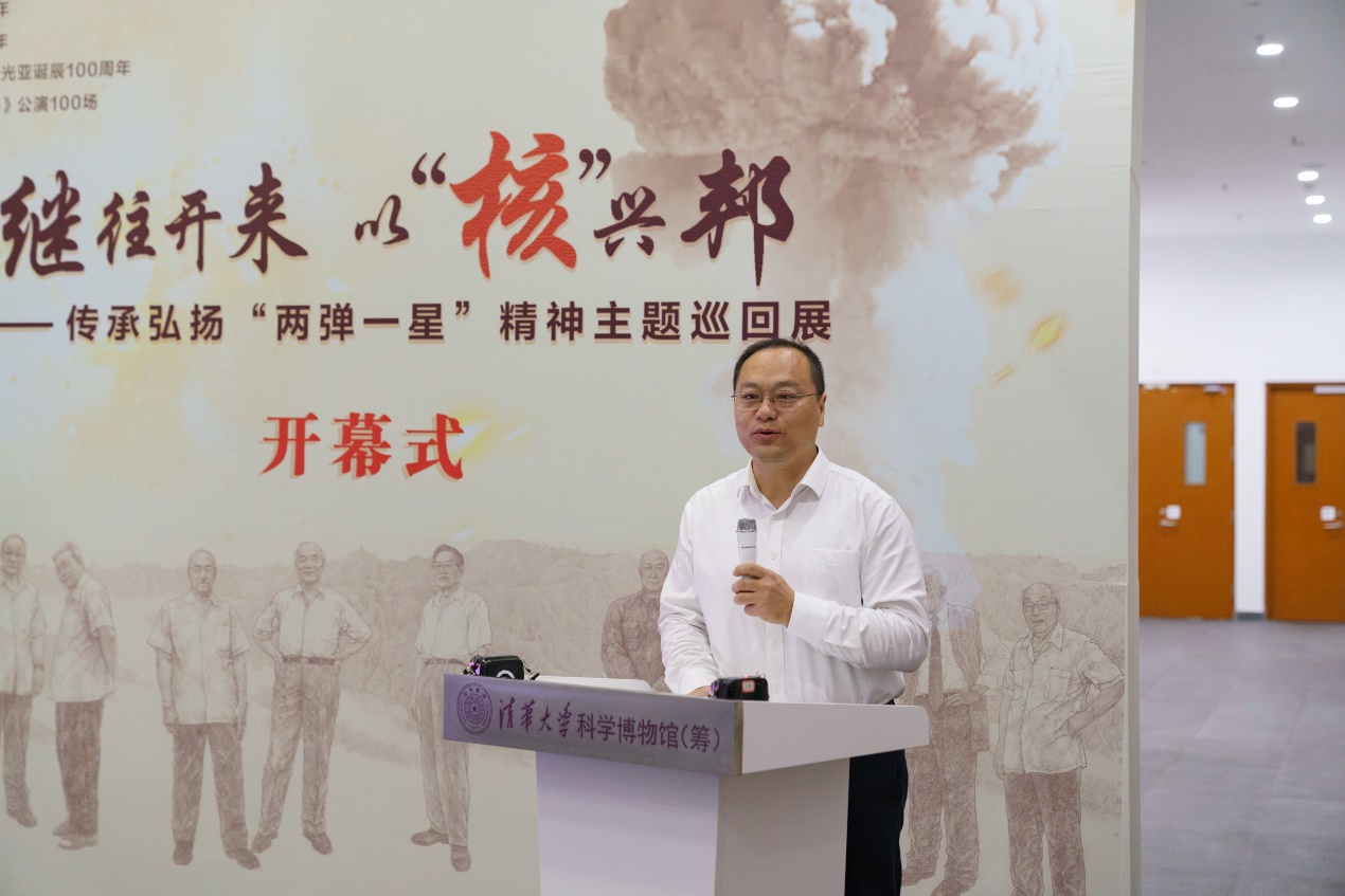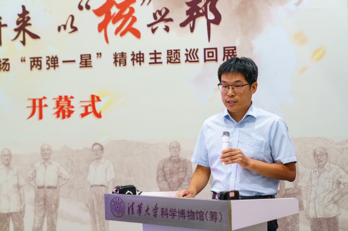 清华大学工程物理系党委副书记黄善仿回顾了工物系与“两弹一星”精神的紧密联系,希望清华学子能够通过此次展览深入学习“两弹一星”精神,并将其融入学习与科研中,为国家富强、民族复兴贡献力量。