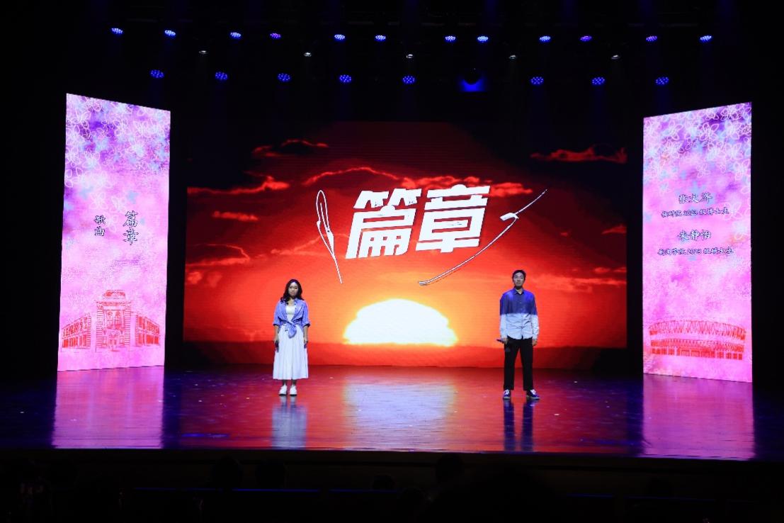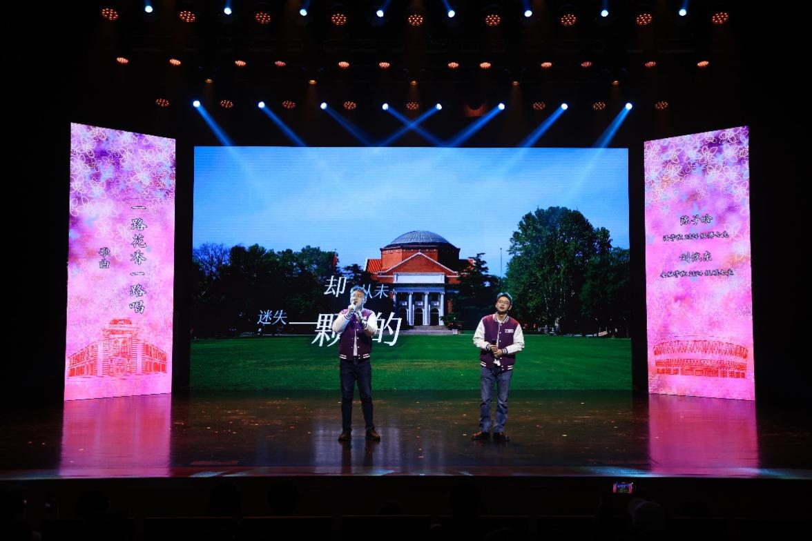 第二篇章“水木情缘”唤起师生校友在清华园里的温暖情谊,校园歌手演唱的《一路花香一路唱》和校友带来的歌曲《少年游》抒发了对于青春岁月的热爱与怀念,咏恒合唱团以一曲《夏天的梦是什么颜色的呢》描绘出夏日的斑斓记忆,而学生艺术团话剧队的《我想在清华做的100件事》则以真挚、活泼的口吻将校园生活中的美好瞬间娓娓道来。