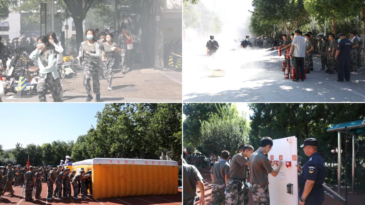 当日上午开展了研究生新生消防疏散演练,全体研究生新生在紫荆操场分批体验了灭火器灭火、逃生屋疏散、按动火灾报警按钮等实操项目。当日下午开展了本科生新生消防演练,活动模拟了紫荆8号楼某宿舍发生火情后,各单位按照火灾应急处置预案开展处置的过程以及全体本科生新生疏散的过程,疏散完成后,全体本科生新生在紫荆操场观摩了滑绳自救、床单结绳自救等技能实操展示以及云梯车高空救援、高喷消防车出水灭火等专业消防救援力量演示,并分批学习和体验了灭火器灭火、逃生屋疏散、按动火灾报警按钮等环节。这也是本科生消防进军训的主要内容。