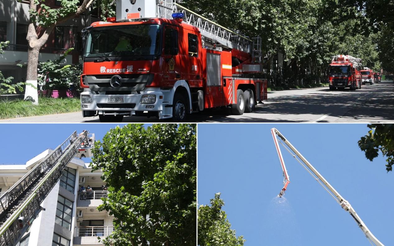 云梯车高空救援、高喷消防车出水灭火等专业消防救援力量演示