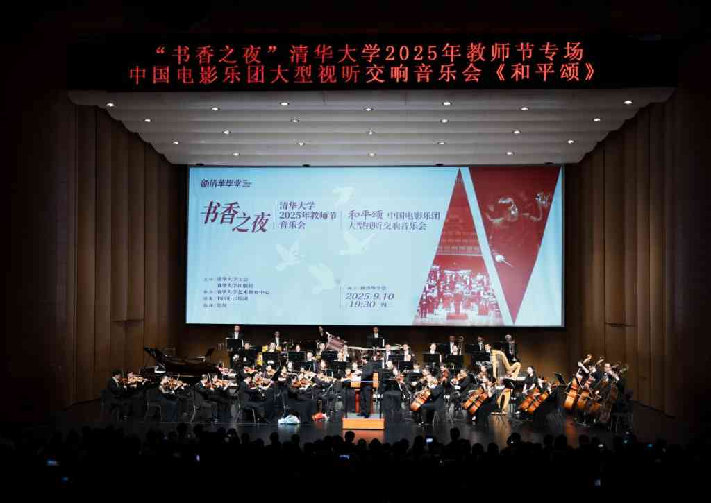 清华新闻网9月18日电 9月10日晚,“书香之夜”清华大学2025年教师节音乐会在新清华学堂上演。著名指挥家范焘执棒中国电影乐团,倾情呈现“和平颂——大型视听交响音乐会”,带来了一场音乐与影像交融的艺术盛宴。校长李路明等与来自学校各单位的教职工代表共1000余人观看演出。