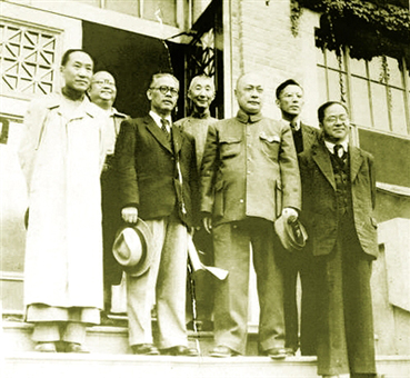 1949年,陈毅参观清华大学。前排左一为叶企孙。