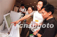 北京清华大学本科新生入学报到日四日开始,该校计算机与信息管理中心研制开发的“清华大学迎新系统”正式投入使用,为实现新生报到的一站式服务提供信息平台。图为新生正在电脑前查询有关信息。作者:张勤