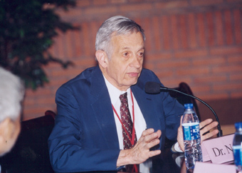 这时,坐在纳什身旁的著名华裔数学家林家翘饶有兴趣地插话说:“纳什的理论既是美的又是实用的。”引得同学们赞许的笑声。 短短40分钟的交流结束了,目送着大师远去的背景,大家心中荡漾起一丝温暖。