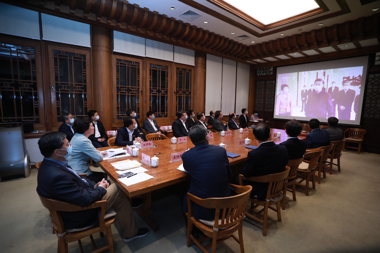 清华新闻网4月20日电(记者 詹萌 摄影 张玉光 曹文鹏)4月19日上午,中共中央总书记、国家主席、中央军委主席习近平考察清华大学并发表重要讲话。4月19日中午,清华大学在工字厅东厅召开党委常委会会议,传达学习习近平总书记重要讲话精神。4月19日晚19点,清华大学召开党委理论中心组学习会,集体收看“新闻联播”节目,畅谈学习收获与体会。校党委书记陈旭主持会议。