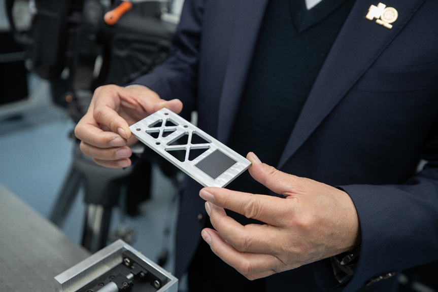 在一台装有光场智能成像芯片的望远镜前,戴琼海向总书记展示了手中的成像芯片。“这个芯片表面集成了几万个特殊的小镜头,用于望远与遥感。在国家天文台兴隆观测站进行了地月40万公里的观测验证实验。”