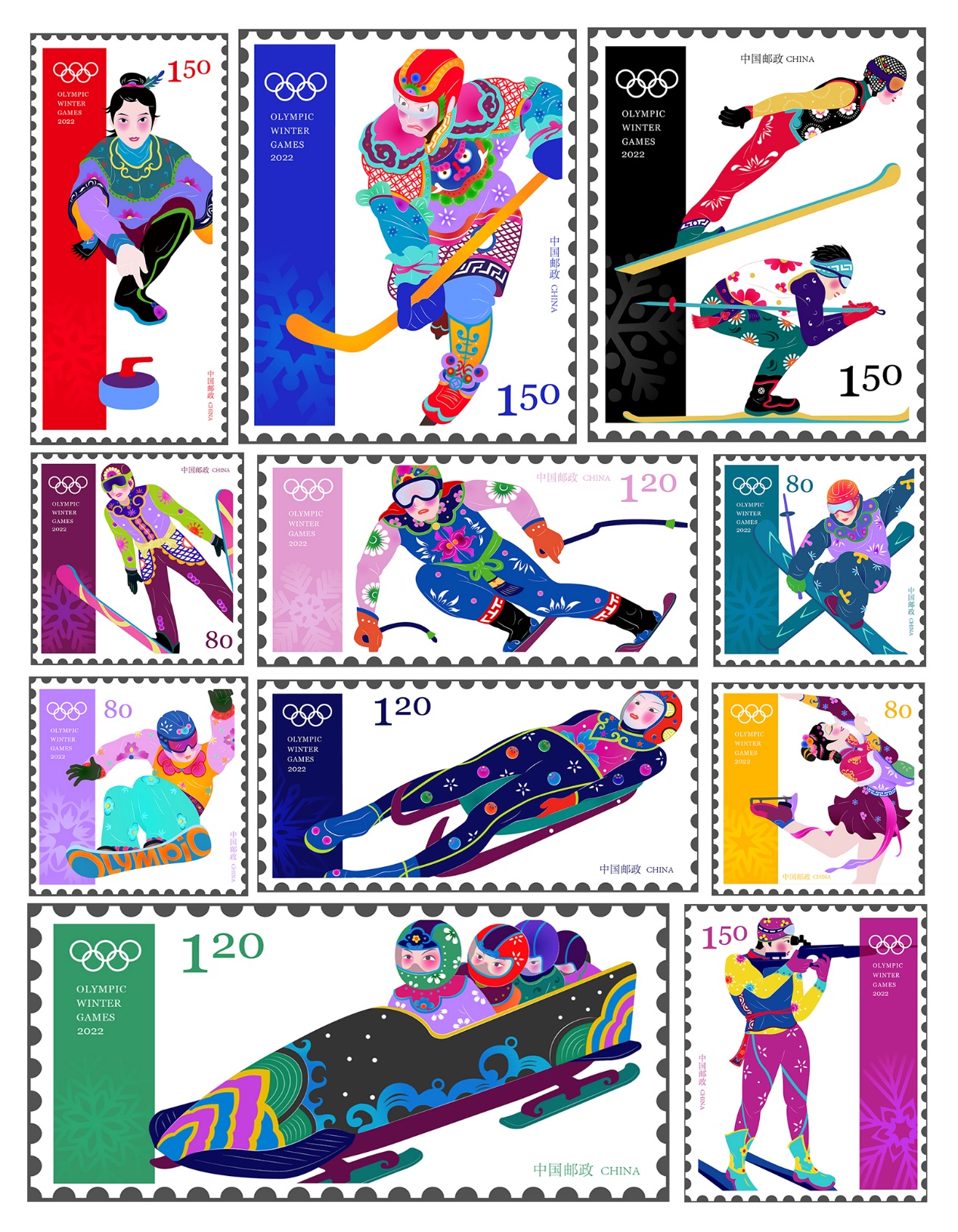 同时,出于普及冰雪运动常识的目的和尝试融合传统图形与现代国际赛事视觉设计的初衷,任和以现有图形为基础,设计了一本介绍各项赛事的图册,册页中插入印有设计图形的透明菲林片,以透明介质还原蔚县剪纸画面通透、正反都能观赏的特色,也进而延展出一套纪念邮票。