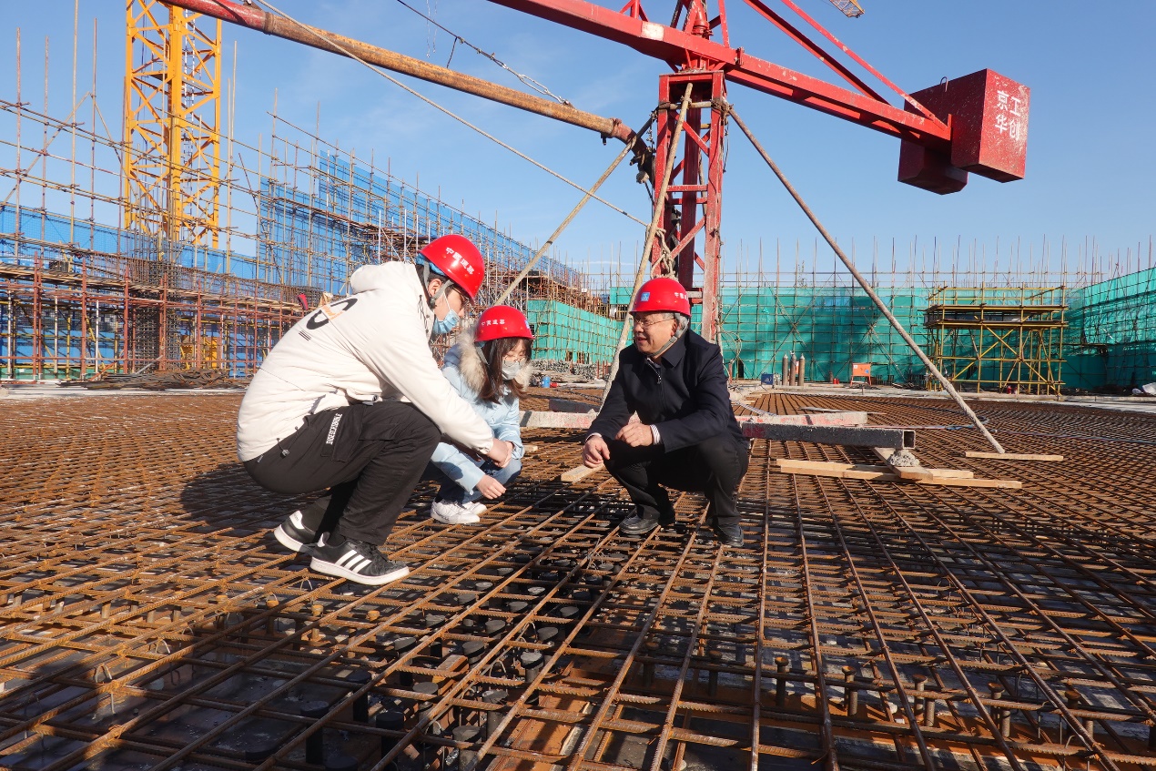 聂建国(右一)在清华大学北体育馆施工现场考察