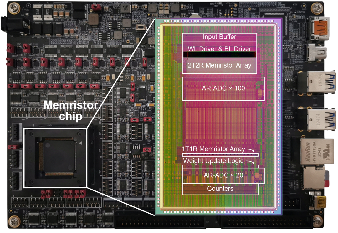 其次,是工程挑战。有了大规模集成的工艺、关键的电路设计,如何克服底层多尺度非理想导致的误差,集合成一个高效的系统芯片?在团队老师和学生的共同努力下,研究提出适用于忆阻器存算一体的高效片上学习的新型通用算法和架构,完成算法优化及仿真实验,制备出全系统集成的高效存算一体学习芯片,实现速度和能效的大幅提升。