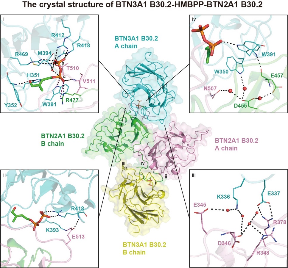 膦抗原促使靶细胞内部BTN3A1与BTN2A1蛋白“黏在”一起后,信号又是如何从内部传导至外部,供γδ T细胞受体感知的呢? 这其中的“中介物”是什么?膦抗原又在其中扮演了怎样的角色?