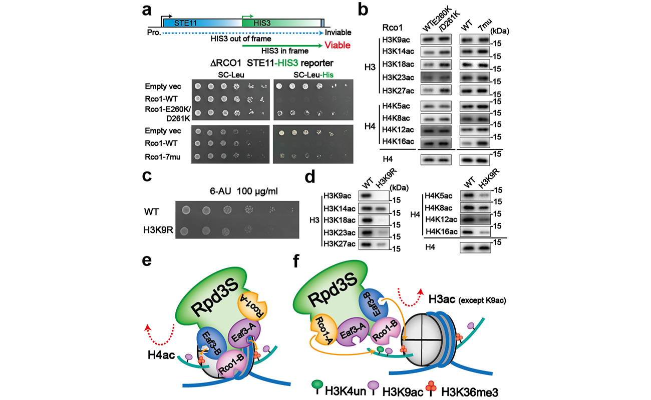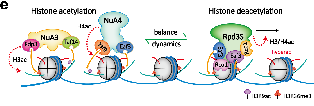 另一种调控模式位于右手一侧。Eaf3和Rco1对未甲基化的H3第四位赖氨酸(H3K4un)和H3K36me3进行组合读取,引导H3去乙酰化。但在该过程中,H3乙酰化的第9位赖氨酸(H3K9ac)修饰被特异性保留,课题组继而对这一特殊情况展开系统研究。研究者通过突变实验影响H3K9ac乙酰化的建立,发现缺失H3K9ac修饰几乎影响着H3和H4所有其他位点乙酰化水平的建立。课题组据此提出,H3K9ac修饰和H3K36me3修饰可以作为“种子”,被乙酰化转移酶NuA3、NuA4识别和快速H3、H4乙酰化修饰重新建立。