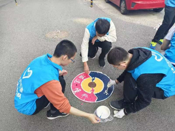 今年3月14日,在前期策划设计的基础上,清华大学电子系无33团支部与美术学院美21、22团支部17位同学来到青云北社区,将前期设计的功能性彩绘图案落地社区。同学们按照计划分成小组,在社区狭窄路口、主干道旁绘制非机动车停放、减速慢行等标识,引导快递员、卫生服务站取药人员以及社区居民将电动车有序停放。同时,彩绘也美化了社区环境,助力文明、安全的社区氛围打造。