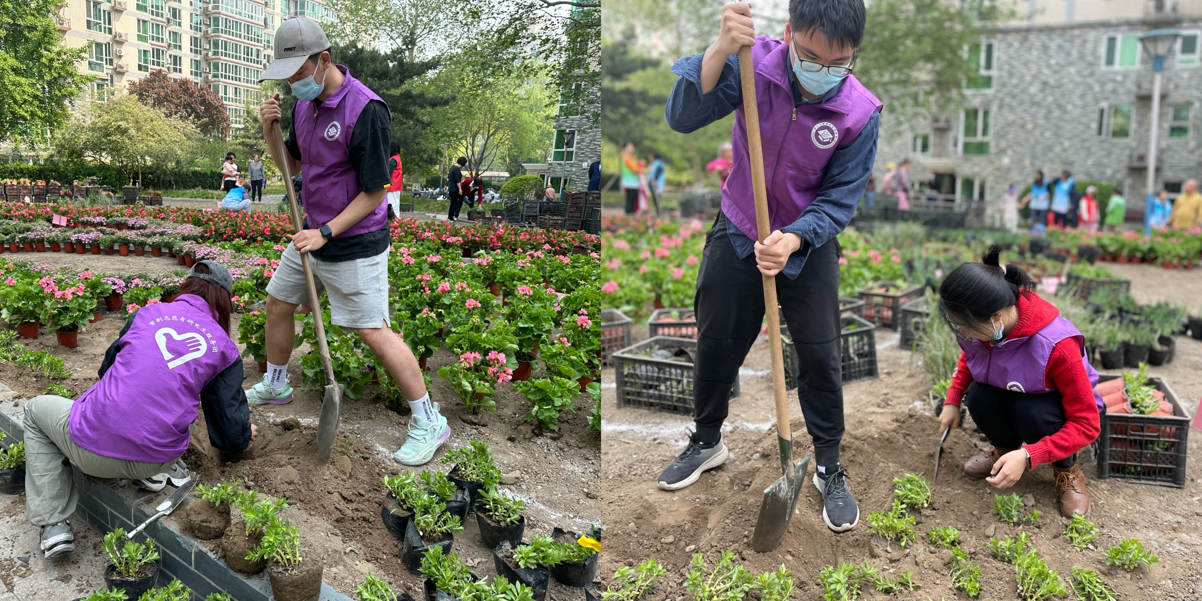 在社区工作人员的介绍下,志愿者们与社区居民们一同学习了共建花园花卉布局的精巧设计。花坛被分为十余个区域,分别种下不同的花卉,不仅做到错落有致,自然成景,而且花种选择丰富,能使园内春夏秋三季有花。领取好工具后,志愿者们来到自己负责的区域,按照规划开始花卉种植。种植花卉的过程中,志愿者们分工明确,配合默契,汗水撒进花圃里,为社区晕染出春天的色彩。