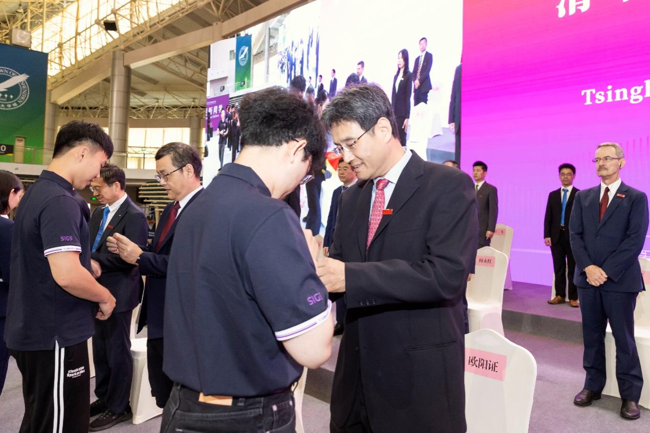 院领导及相关教学科研机构负责人为新生代表佩戴清华大学徽章