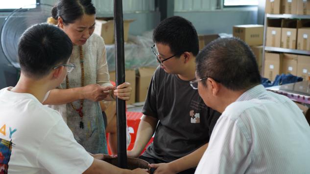 在梅城镇连心岭擂茶基地,同学们亲身体验非遗项目“梅城擂茶”的制作技艺,感受劳动乐趣与非遗文化魅力。安化一中李岱奕同学向支队成员介绍了擂茶文化如何融入当地婚礼、迎客、日常饮食等生活场景。来自广东的清华同学陈卓感慨:“擂茶不仅是一种技艺,更是一种承载当地文化与情感的纽带。”传递擂钵、共制擂茶,迅速拉近了两校学生的距离。